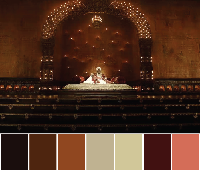 The scene is lit with lamps and traditional baithak for the king. Its in the tones of orange or deep saffron which is the colour of sacrifice, light, salvation in the Maratha religion. Saffron is the colour of Hinduism.