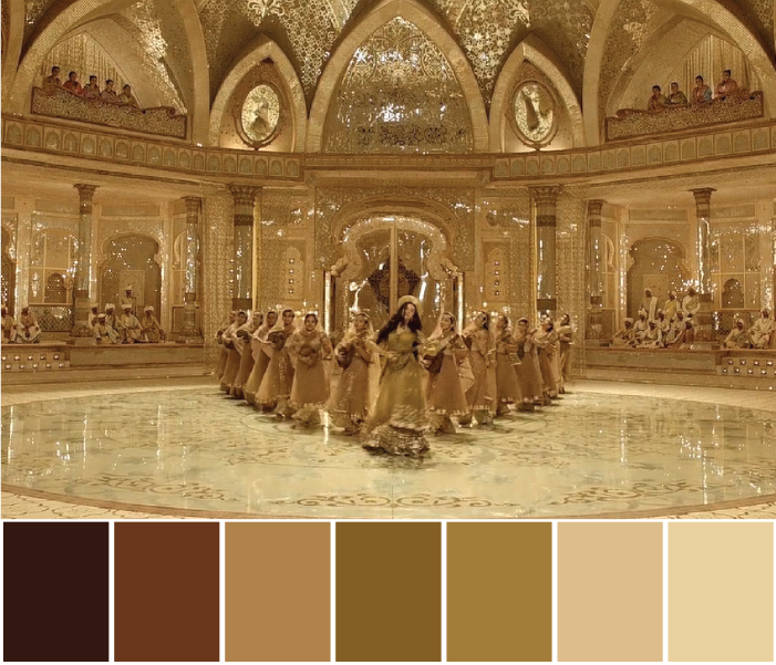 Mastani’s character was mystical and fearless. In the song Deewani Mastani she is dancing and showing her love for Bajirao with this beautiful setting. The monochromatic colours blend everything in the moment. The Muslim background of Mastani was shown through the dresses she wore with sharara, lehnga. She wears reds, yellows, orange, maroon in the film as per the mood in the scene.