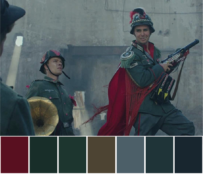 Jojo starts to doubt his imaginary friend, his mother's loss, the awakening, all this has affected Jojo which is depicted through the colour of his clothes. The colours from the start of the movie have gone and the palette of the film shifts from summertime to winter. The sweet and funny side of the film has turned sad. The greys and saturated tones fill the film's looks.