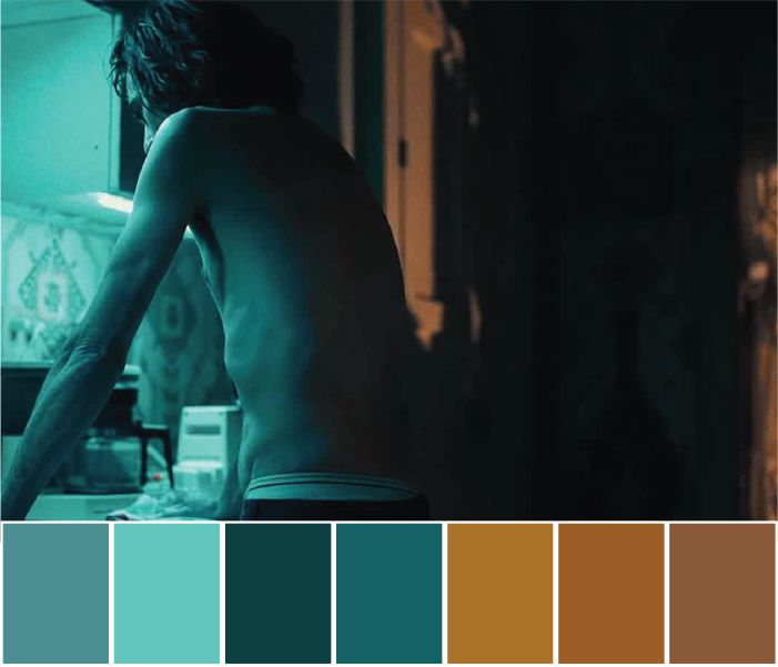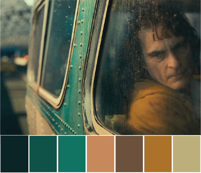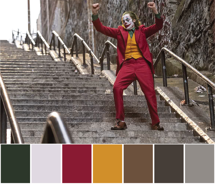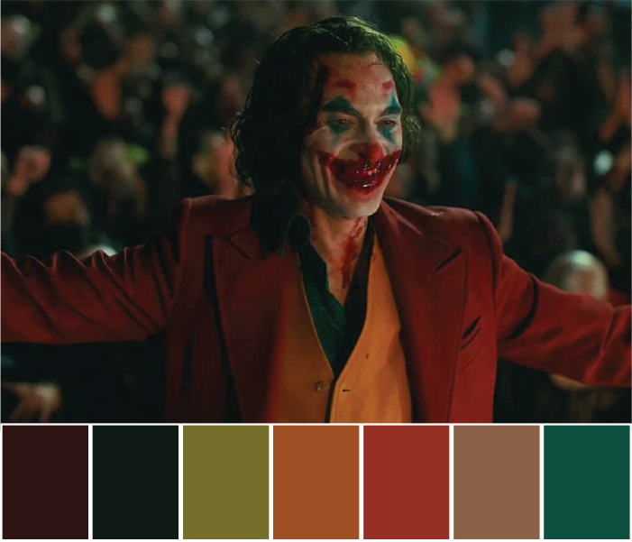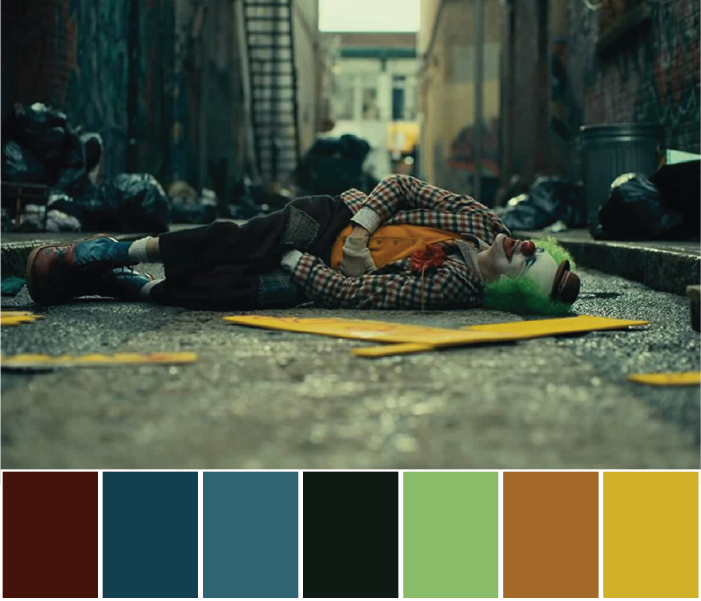 The colours are used to show the opposite ends of the spectrum, two sides of yourself, shadow and light. Most of the scenes use complementary colours. There is a slow process of Arthur Flex turning to Joker.