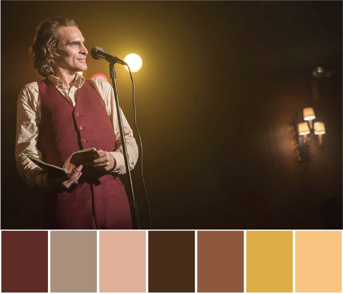 The red suit is the same as the Joker red by desaturating to show that he is still Arthur. The moment is about Arthur as the spotlight focuses on him but the light used overexposes the character and background is blurred by that. It light brings him in the front where he cannot hide from anyone. It's like an interrogative light.