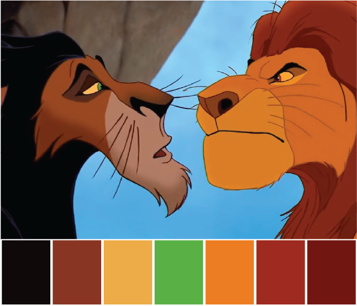 The contrast of the behaviour is seen perfectly in this scene. The dark browns of Scar show the negative and the evil nature of him, whereas the bright ochre yellow shows the goodness in Mufasa.