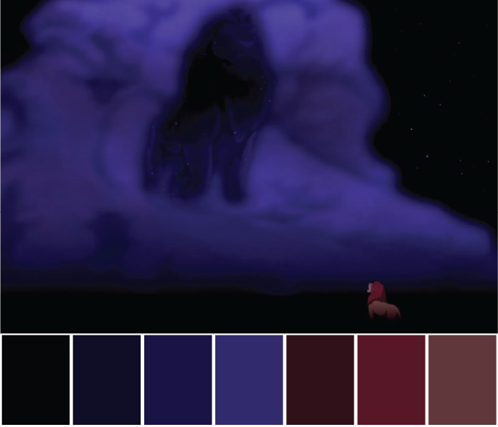 The magical moment when Simba sees Mufasa amongst the clouds is denoted with purple colour. Purple symbolises mystery and magic. Hence, the scene is impactful by using the purple colour to show the power and majesty of Mufasa.